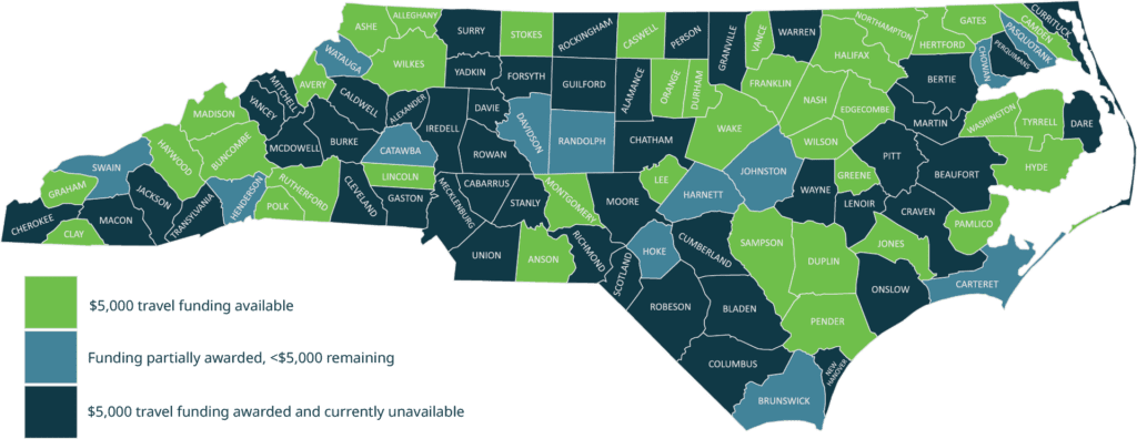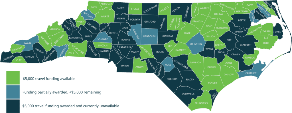 There is a $5,000 cap PER COUNTY for TRAVEL funding only: Check the grant availability map and table below to see if your county has already received the travel funding cap before applying. The funding cap resets at the end of the fiscal year – if your county has reached its cap for this year please return in July of the next fiscal year.